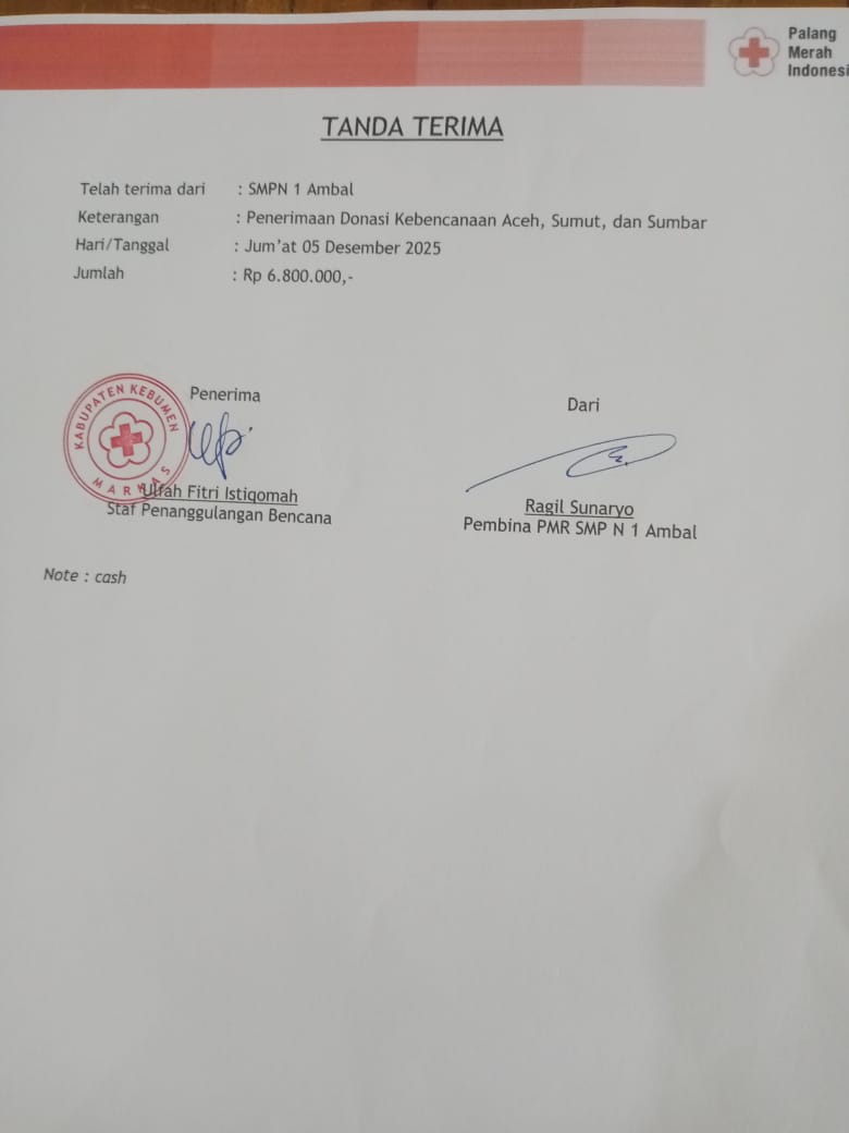 Ambal (05/12/2025)_ Di tengah duka yang menyelimuti sejumlah wilayah di Sumatra akibat bencana banjir dan longsor, keluarga besar SMP Negeri 1 Ambal menunjukkan kepedulian mendalam melalui aksi donasi kemanusiaan. Pada Jumat, 5 Desember 2025, sekolah tersebut secara resmi menyerahkan hasil penggalangan dana kepada Palang Merah Indonesia (PMI) Kabupaten Kebumen untuk kemudian disalurkan kepada para korban yang membutuhkan, yaitu masyarakat Aceh, Sumatra Utara dan Sumatra Barat.