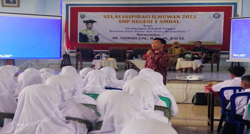 Selasa, 27 September 2022 SMP Negeri 1 Ambal mengadakan Kelas Inspirasi Ilmuan 2022 bersama Dr Tuswadi, S.Pd., M.Ed., Ph.D in Ed, dengan tema Membangun Sekolah Unggul Besama Guru Pintar dan Siswa Berkarakter.