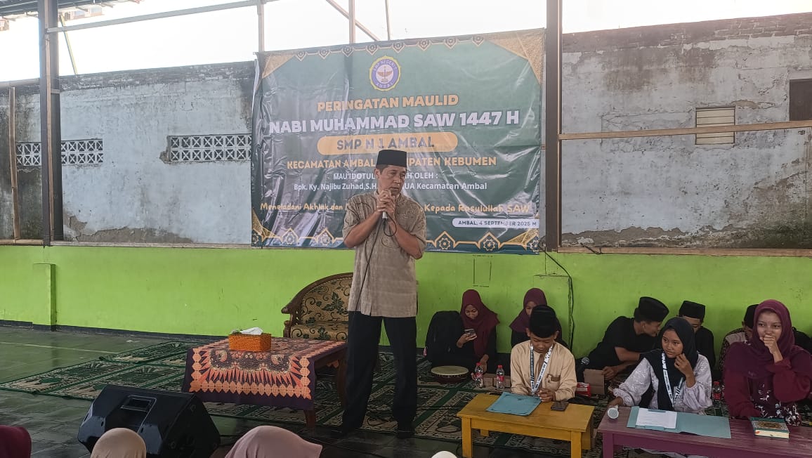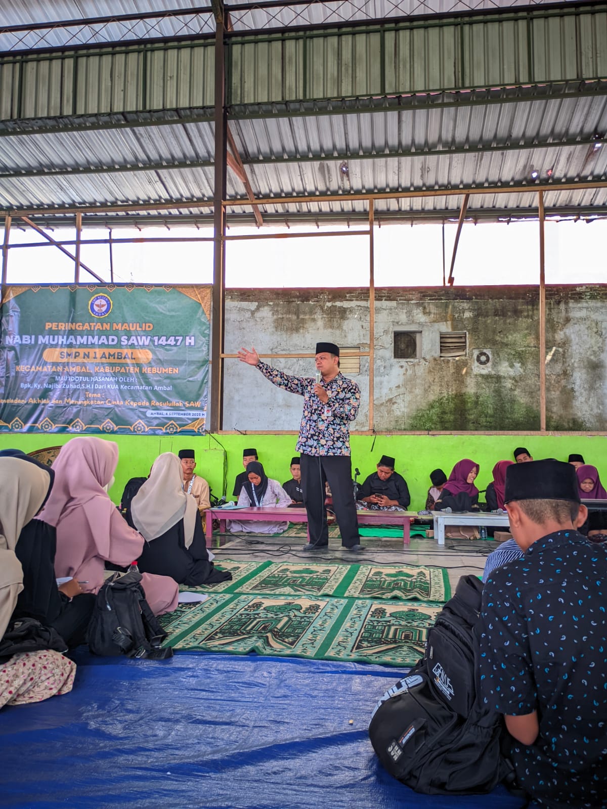 SMP Negeri 1 Ambal pada Hari Jumat (5/9/2025), baru saja menggelar Peringatan Maulid Nabi Muhammad SAW dengan khidmat dan penuh makna yang berlangsung di GOR sekolah. Kegiatan ini menjadi agenda tahunan yang tidak hanya bersifat seremonial, tetapi juga sebagai upaya membentuk karakter murid agar memiliki akhlak mulia, sesuai dengan teladan yang diwariskan Rasulullah. Tema yang diusung yaitu “Meneladani Akhlak dan Meningkatkan Cinta kepada Rasulullah” dan diikuti oleh ratusan siswa, guru, serta tenaga kependidikan.