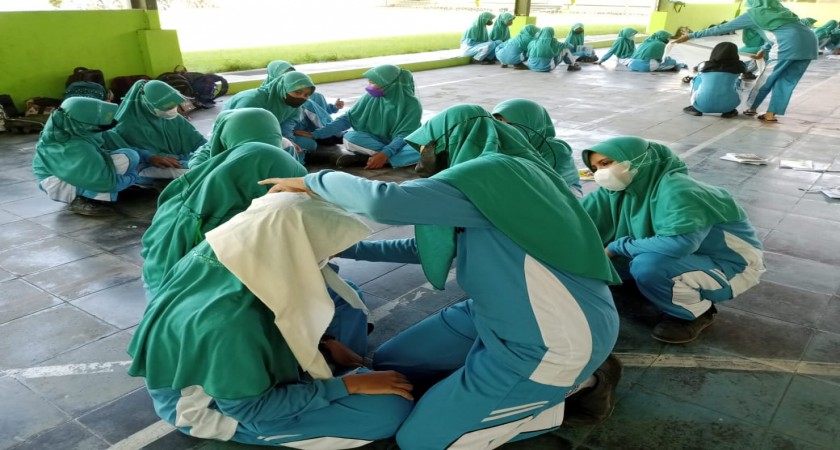 “Hari ini materinya menyenangkan, kita bisa membalut luka dengan benar,” demikian komentar salah satu relawan putra, Daffa dari kelas VII D saat menjawab refleksi kegiatan hari itu.